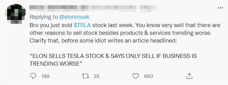 兄弟,你上周刚卖了特斯拉的股票。你很清楚,除了产品和服务变得更糟之外,还有其他原因需要出售股票。赶紧澄清一下,在某个白痴写一篇标题为‘埃隆出售特斯拉股票,并且说只有在业务恶化时才出售’的文章之前。