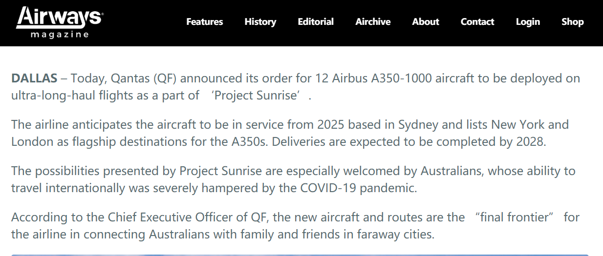 澳洲航空表示,将订购12架空客A350-1000飞机用于Project Sunrise航班。该公司称,这些飞机将能够直接连接澳大利亚和世界上任何地方,例如从澳大利亚东海岸到伦敦和纽约的直飞航班。