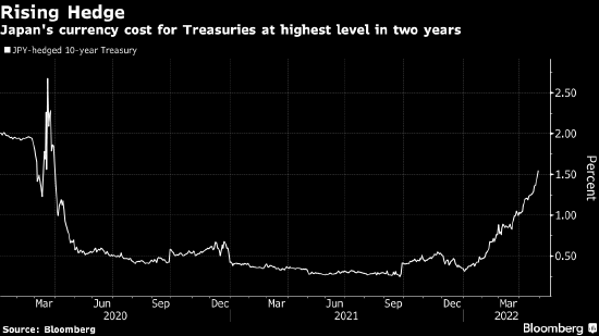 虽然10年期美国国债收益率在纽约时段距离3%仅一线之隔,但对于为防范日元兑美元汇率波动而付出对冲成本的买家而言,其实际收益率已降到1.3%。这是因为对冲成本升至1.66个百分点,为2020年初以来的最高水平,当时疫情引发的市场动荡造成全球美元需求飙升。