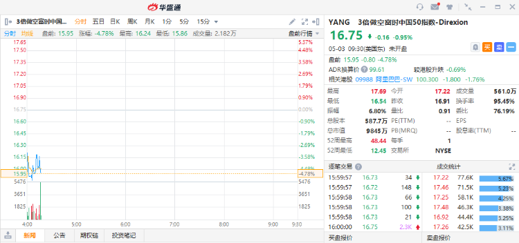 部分中概股小幅上扬,每日优鲜(MF)涨5.03%,雾芯科技(RLX)涨3.9%;小鹏汽车涨1.93%;网易、爱奇艺涨超1%;阿里巴巴(BABA)盘前一度涨近1%,现涨幅收窄至0.39%,阿里巴巴港股今日盘中上演深V逆转;3倍做多富时中国50指数ETF YINN (YINN)盘前涨超4%;3倍做空富时中国50指数 ETF YANG(YANG)盘前跌近5%。