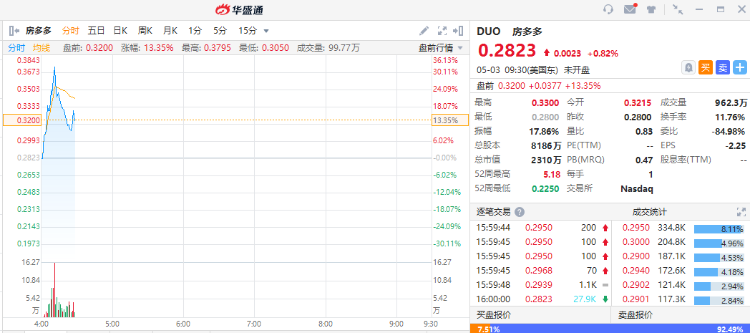 华盛资讯5月3日消息,美股盘前,房多多(DUO)盘前再度活跃,现涨超13%报0.32美元。该股上周五收涨13%。