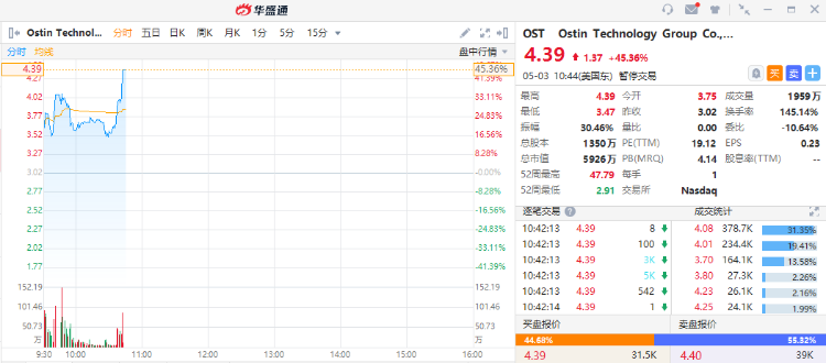 华盛资讯5月3日讯,美股早盘,部分中概股走高,次新股奥斯汀科技大涨超45%,盘中触发临停。