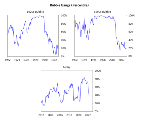 我们不需要瑞·达利欧来告诉我们说股市的一些泡沫已经萎缩,这一点谁都知道。不过,通过他最新更新的市场泡沫指标,我们至少还可以得到一点有价值的结论:根据历史经验,股市还有下跌空间,特别是那些不盈利的科技公司。