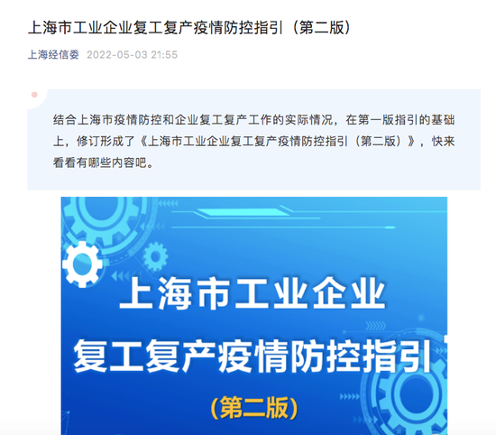 同样在5月3日晚间,上海市经信委官方微信公众号发布消息称,结合上海市疫情防控和企业复工复产工作的实际情况,在第一版指引的基础上,上海市经信委修订形成了《上海市工业企业复工复产疫情防控指引(第二版)》。
