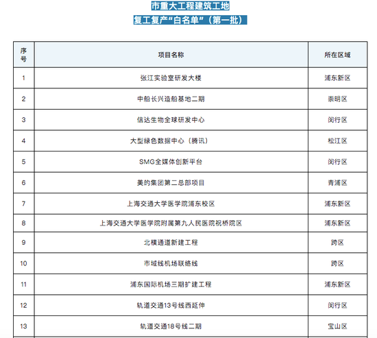 上海市住建委发布《上海市重大工程建筑工地复工复产“白名单”》(第一批),共包括24个重大工程建筑工地,含腾讯、阿里巴巴、中芯国际、上海机场、美的集团、药明生物、和辉光电等知名企业项目。