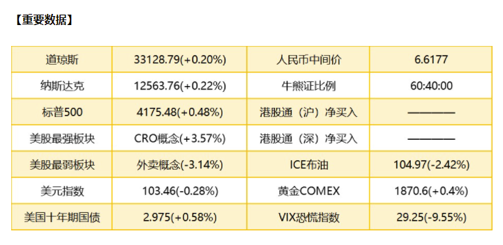 1. 隔夜美股截至收盘,道指涨67.29点,涨幅为0.20%,报33128.79点;纳指涨27.74点,涨幅为0.22%,报12563.76点;标普500指数涨20.10点,涨幅为0.48%,报4175.48点。港股ADR指数下跌,按比例计算,收报21076点,较香港收市跌24.7点或0.12%。