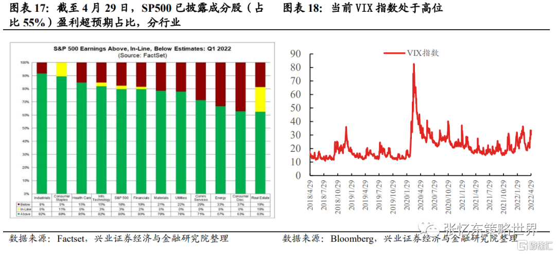 首先,美国短期“经济韧性”的信号依然较强,1季度的美股盈利总体还不错。其次,4月份美股市场情绪得到一定程度释放——截至4月29日VIX指数为33.4,处于1990年以来的95%分位数水平,全球风险溢价指数也处于历史相对高位。