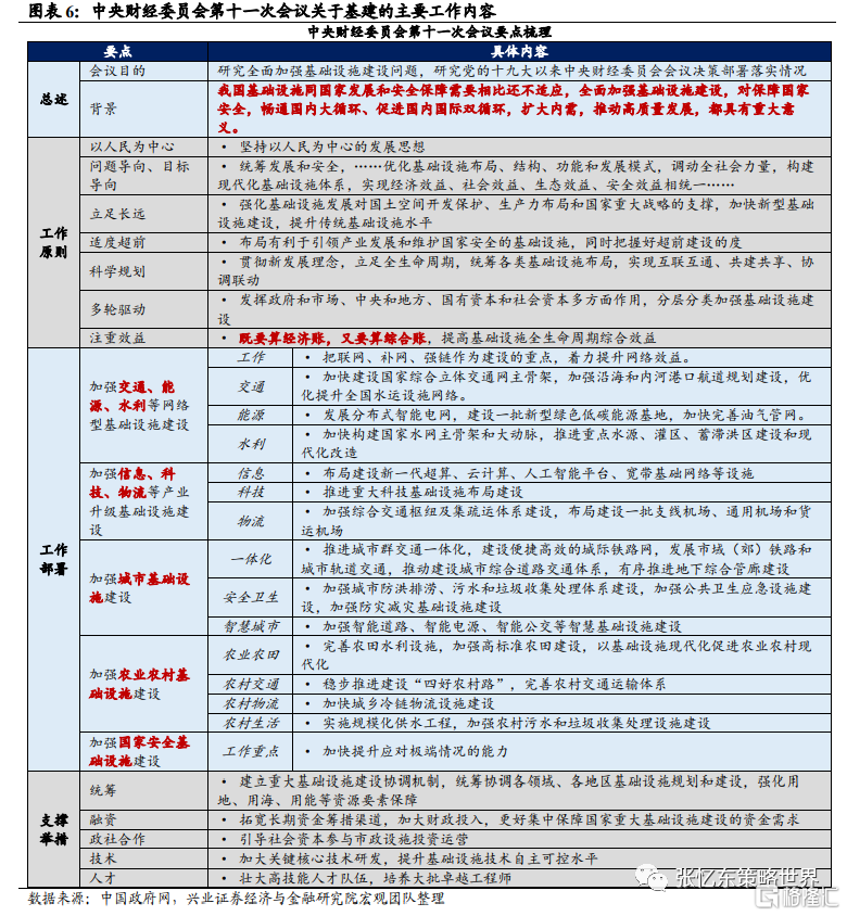 4月26日,习近平主持召开中央财经委员会第十一次会议,强调“全面加强基础设施建设,构建现代化基础设施体系,为全面建设社会主义现代化国家打下坚实基础”。建设方向上,会议共强调了五大领域,分别是:1)加强交通、能源、水利等网络型基础设施建设;2)加强信息、科技、物流等产业升级基础设施建设;3)加强城市基础设施建设;4)加强农业农村基础设施建设;5)加强国家安全基础设施建设。