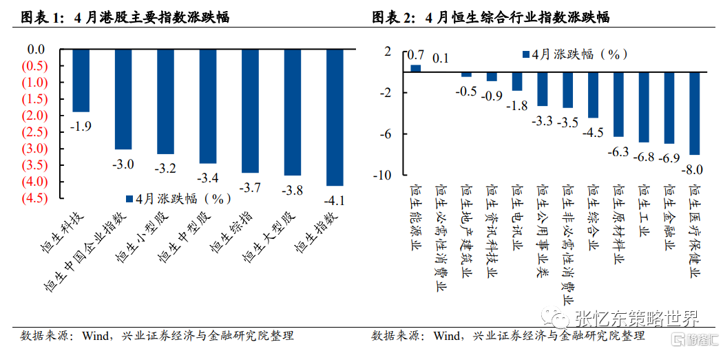 4月份港股主要指数中,恒生指数跌4.1%,恒生国指跌3.0%;恒生大型股跌3.8%,恒生中型股跌3.4%,恒生小型股跌3.2%,恒生科技跌1.9%。行业上,恒生能源业(涨0.7%)、必需性消费业(涨0.1%)领涨,医疗保健业(跌8.0%)、金融业(跌6.9%)和工业(跌6.8%)领跌。