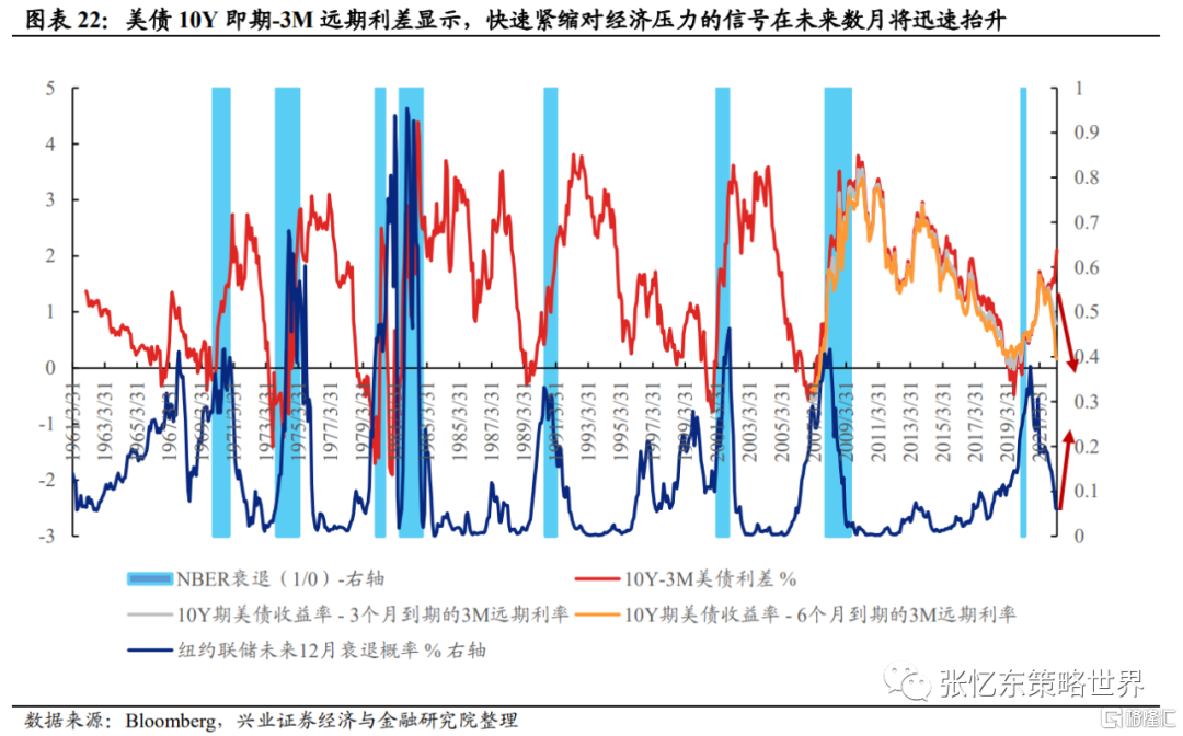 虽然当前10Y-3M利差所隐含的衰退概率依然较低,但是随着联储进入快速紧缩阶段,10Y-3M利差会迅速缩窄,把3个月美债即期利率替换成远期利率,截至4月29日,10Y美债-6个月到期的3M远期美债利差仅0.16%。也就是说,快速紧缩对经济压力的信号在未来数月迅速抬升。