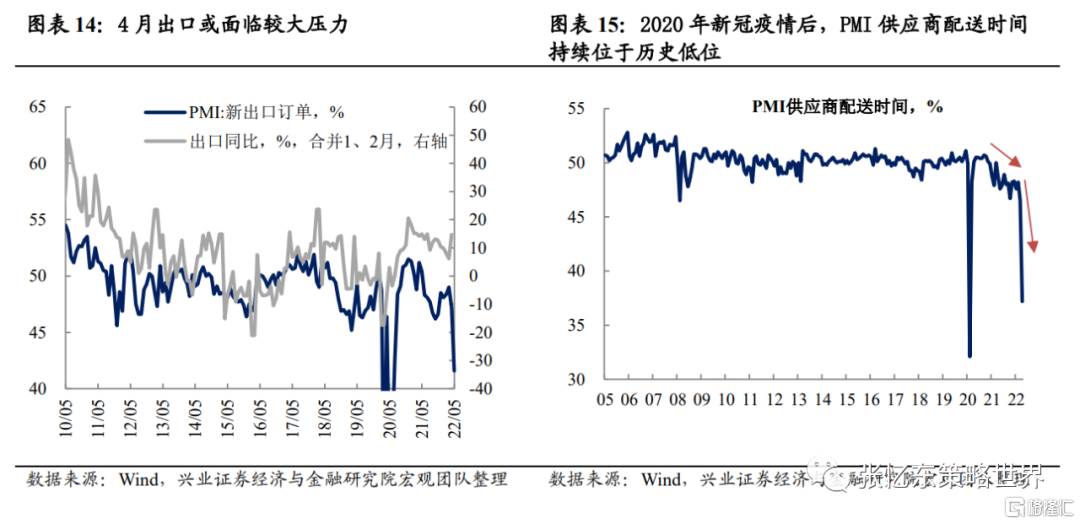 外需方面,4月PMI新出口订单指数大幅下滑至41.6%,新订单减少意味着后续针对外需的生产减少,出口将承压。