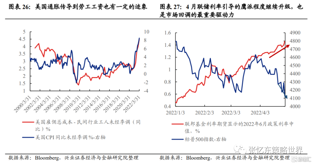 第三,考虑到能源价格对美国通胀的滞后传导、CPI服务业分项的落后补涨、通胀向工资传导的迹象显现、中国供应链的修复难一蹴而就,依然需要警惕通胀的持续性超预期的风险,从而使得联储对于更远端的利率引导再次进一步鹰派,再次引发市场回调——事实上,4月联储的利率引导的鹰派程度继续升级,也是市场回调的重要驱动力。