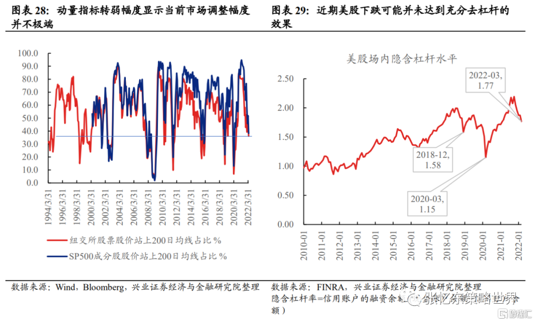 第五,美股市场行为分析:类比近些年来的股市大幅回调的情形,动量指标转弱幅度显示当前市场调整幅度并不极端,此外,近期美股下跌可能并未达到充分去杠杆的效果。