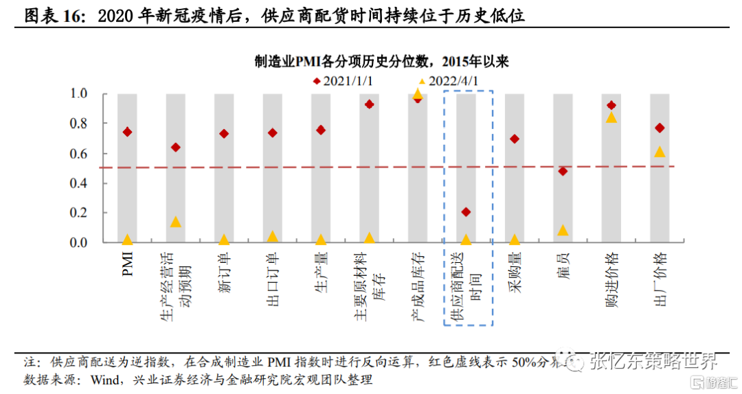 疫情冲击对于供应链的长尾效应更加显著,供应修复的过程可能依然步履蹒跚。参考2020年疫情冲击到2021年年初这段时间,PMI的各个分项都出现了或多或少的修复,但是供应商配送时间始终位于历史低位水平。本次疫情冲击之下,4月PMI供应商配送时间指数大幅下降至37.2%,仅略高于2020年2月的32.1%。