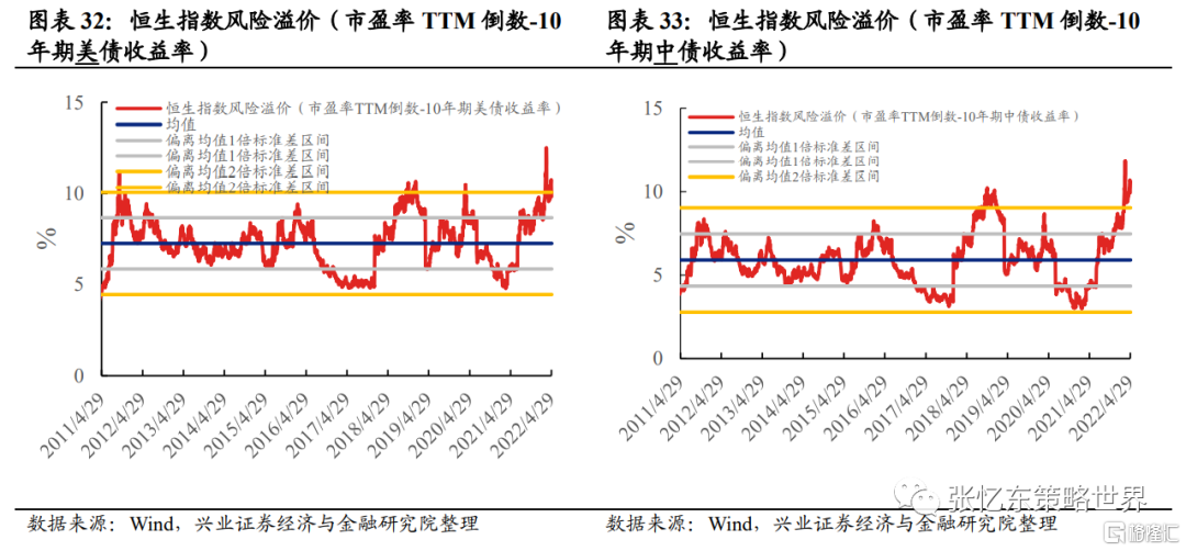 截至4月29日, 用市盈率TTM倒数-10年期美债收益率衡量的恒生指数风险溢价位于2011年以来均值+2倍标准差附近;用一致预测市盈率-10年期中债收益率衡量的恒生指数风险溢价向上偏离2011年以来均值+2倍标准差以上。