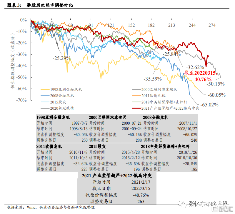 以互联网、房地产行业从严监管为契机、俄乌战争为加速器的港股大调整,截止2022年3月15日265交易日仅次于2000-2001年互联网泡沫破灭的288日;跌幅40.76%仅次于2008年金融危机65%、互联网泡沫破灭60%、1997-98年亚洲金融危机50%。
