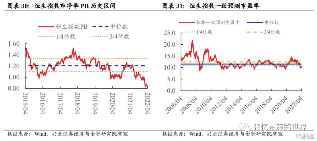 截至4月29日,恒指预测PE(彭博一致预期)为10.4倍,位于2005年以来的13%分位数水平。