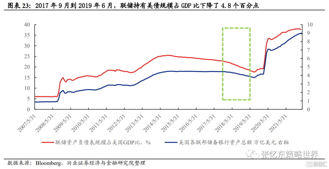 联储论文《Substitutability of Monetary Policy Instruments》的结论是,联储在2017年9月到2019年6月(合计21个月)缩表影响约等于30bp的加息效果,期间联储持有美债规模占GDP比下降了4.8个百分点。