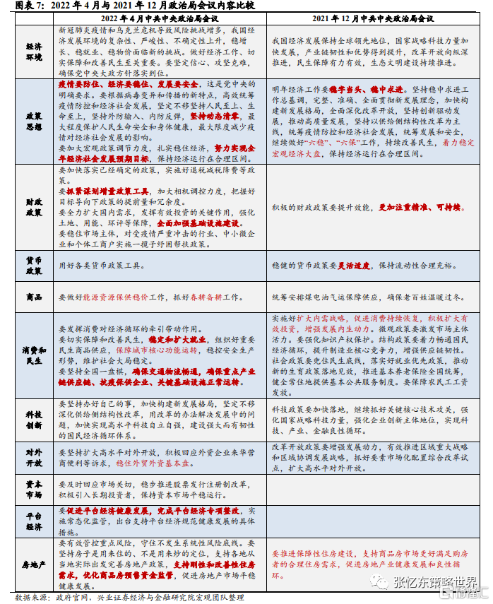 4月29日中央政治局召开会议,分析研究当前经济形势和经济工作,会议要求“要加大宏观政策调节力度,扎实稳住经济,努力实现全年经济社会发展预期目标,保持经济运行在合理区间”。各个领域的定调而言,地产“支持各地从当地实际出发完善房地产政策,支持刚性和改善性住房需求,优化商品房预售资金监管”;平台经济领域“要促进平台经济健康发展,完成平台经济专项整改,实施常态化监管,出台支持平台经济规范健康发展的具体措施”;资本市场“积极引入长期投资者,保持资本市场平稳运行”;对外开放“要坚持扩大高水平对外开放,积极回应外资企业来华营商便利等诉求,稳住外贸外资基本盘”。