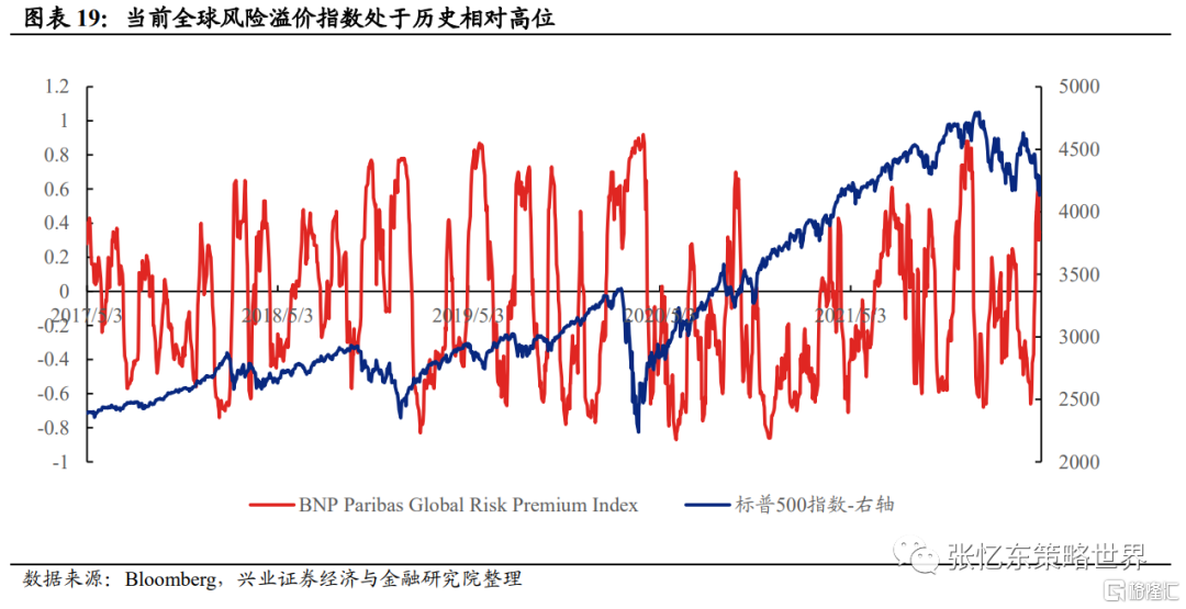截至4月29日,VIX指数为33.4,处于1990年以来的95%分位数水平,全球风险溢价指数也处于历史相对高位。