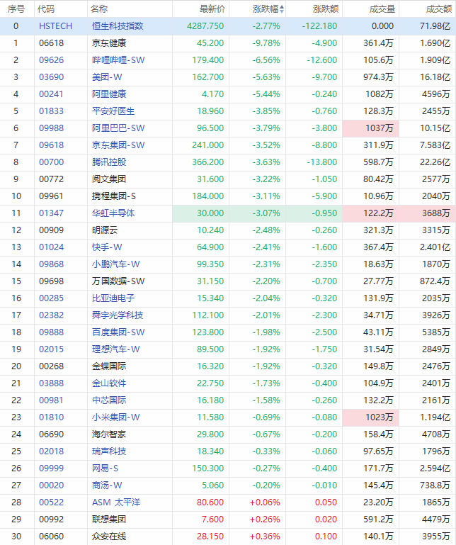 盘面上,科网股普遍走低,京东健康跌近10%领跌,报45.2港元;B站跌超6%,阿里健康、美团跌超5%,阿里巴巴、京东、腾讯跌逾3%,快手、小鹏汽车跌超2%。