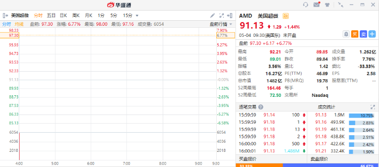 华盛资讯5月4日消息,美股盘前,美国超微 $AMD 绩后大涨6%。