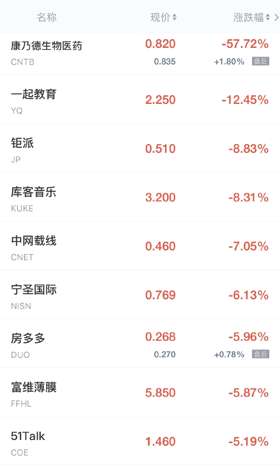 一起教育跌超12%,中网载线跌超7%,51Talk跌超9%,红黄蓝跌超4%,名创优品跌超3%,凤凰新媒体跌超2%,BOSS直聘跌近2%,趣头条跌近1%。