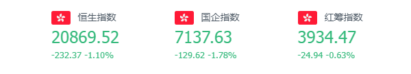 截至周三收盘,恒生指数跌1.1%,报20869.52点;国企指数跌1.78%,红筹指数跌0.63%。恒生科技指数跌3.29%,哔哩哔哩跌8.18%,快手跌5.79%,美团跌4.58%。
