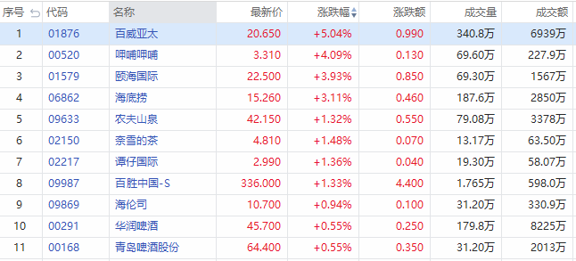 其他个股方面,呷哺呷哺涨超4%,颐海国际、海底捞涨超3%,农夫山泉、谭仔国际、奈雪、百胜中国涨逾1%,海伦司、青岛啤酒股份、华润啤酒跟涨。