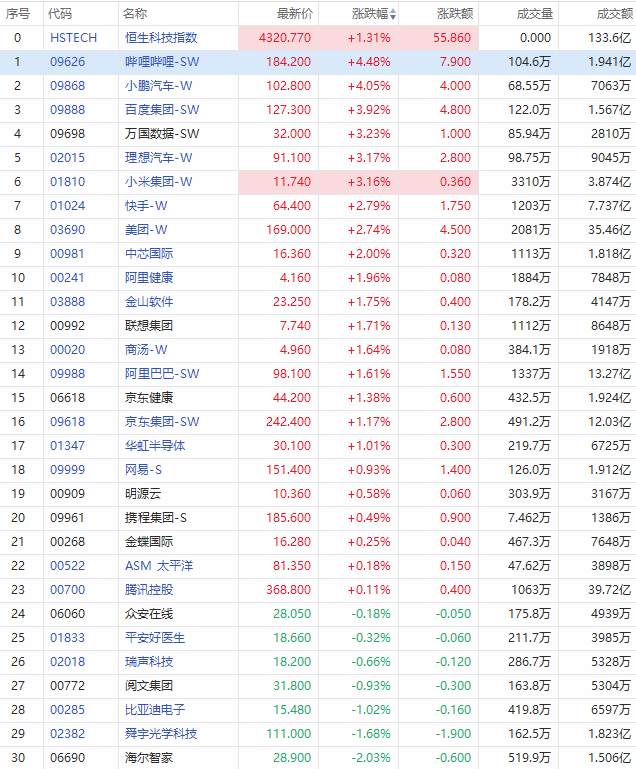 盘面上,科网股普遍反弹,哔哩哔哩、小鹏汽车涨超4%,百度、理想汽车、小米集团涨超3%,快手、美团、中芯国际涨超2%,阿里健康、京东健康、阿里巴巴、京东集团涨超1%。