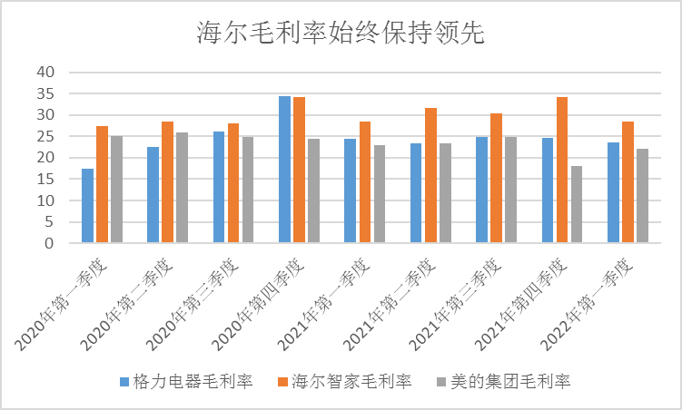 这体现在了三家的财报中。2021年报显示,美的海外毛利率为21.76%,同比-3.03%;格力海外毛利率为9.84%,同比-2.29%;海尔智家海外毛利率为28.21%,同比+0.2%。