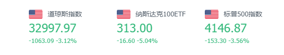 道指周四收跌跌1063.09点,跌幅为3.12%,报32997.97点;纳指跌647.16点,跌幅为4.99%,报12317.69点;标普500指数跌153.30点,跌幅为3.56%,报4146.87点。特斯拉收跌8.33%、苹果收跌5.57%、亚马逊收跌7.56%。