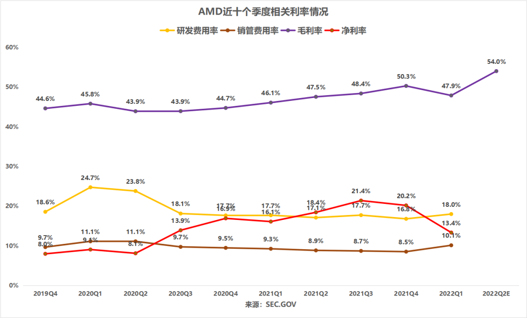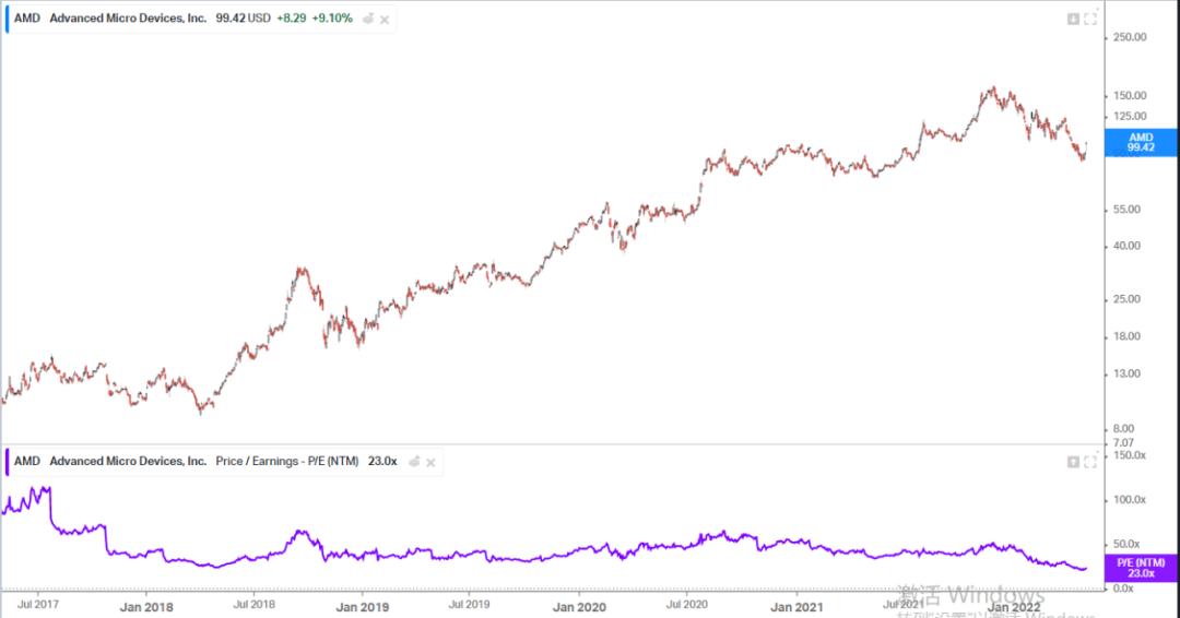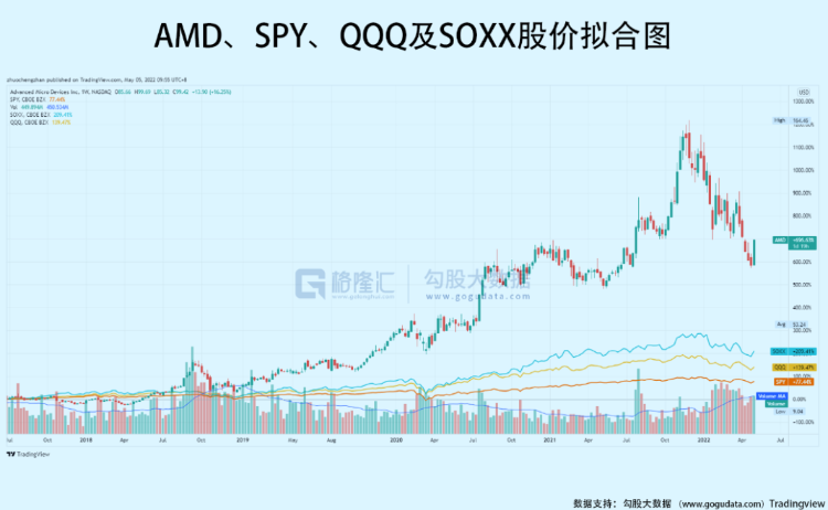 截止22年5月4日收盘,AMD 21年全年涨幅为56.91%,22年至今涨幅为-30.91%,大幅跑输同期标普500指数ETF、纳指100ETF及费城半导体指数的涨幅。