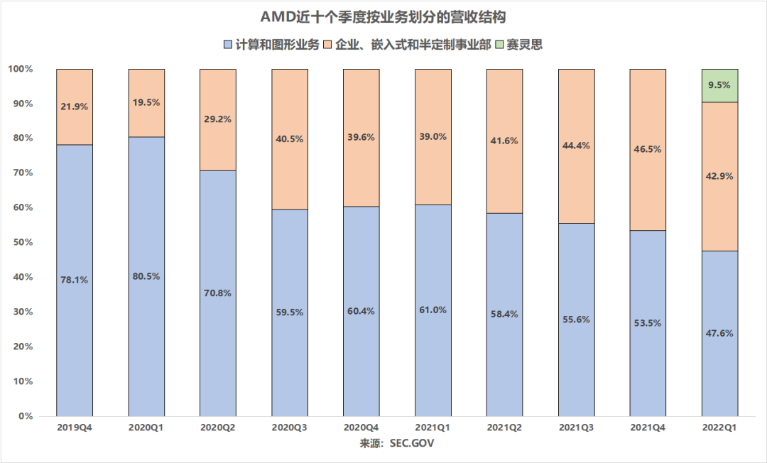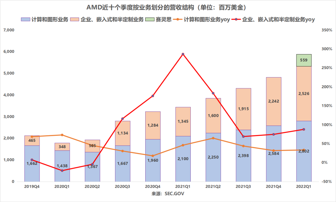 2月14日,AMD斥资350亿美元以全股票交易方式完成了对FPGA龙头赛灵思的收购。在收购完成后的六周内,赛灵思贡献了5.59亿美元营收,其中运营利润达2.33亿美元。在整季的预期(pro forma)基础上,赛灵思创造营收将同比增22%至超10亿美元,连续四个季度实现超20%的同比增速,连续两个季度实现超10亿美元的收入。