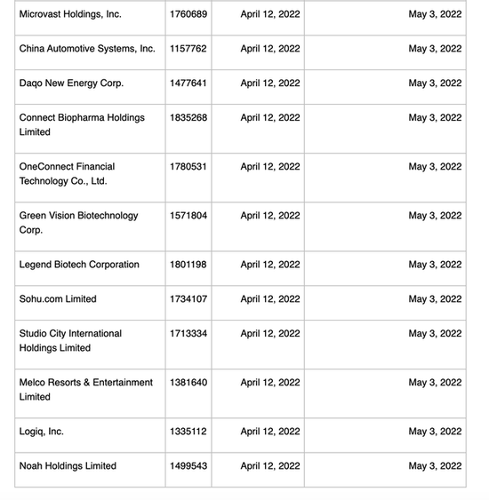 2022年5月4日,美国证券交易监督委员会(SEC)将88家中概股纳入“预摘牌”名单,名单内新增的中概股公司包括华能国际、中国铝业、哔哩哔哩、拼多多、36氪、腾讯音乐、携程、小鹏汽车、京东、中国移动、网易、蔚来、中国石油、科兴生物、东方航空、南方航空等公司。针对“预摘牌”原因,SEC给出的解释是“无法检查这些公司的审计底稿”,并要求这些公司在5月25日前提交申辩。