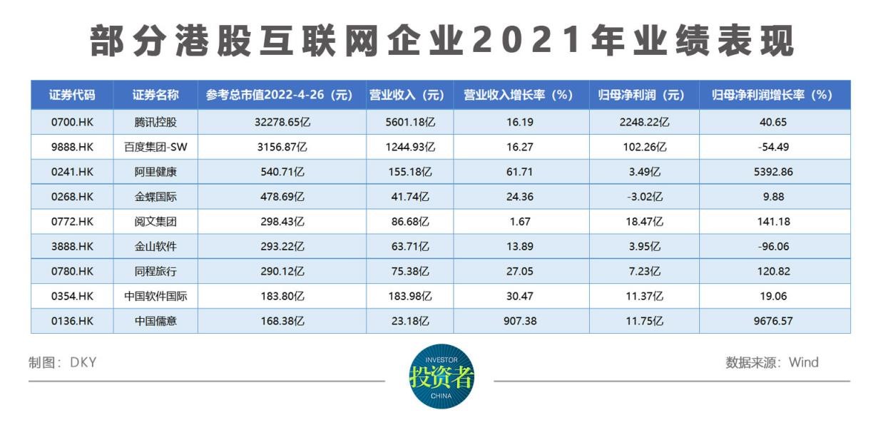 从腾讯控股、百度集团、阿里健康、金蝶国际、阅文集团、金山软件、同程旅行、中国软件国际、中国儒意9家港股互联网上市公司看,2021年这9家企业累计实现营业收入7476亿元,同比增长近17.46%;归母净利润2404亿元,同比减少28.3%。其中,阅文集团(0772.HK)的归母净利润同比增长141%,同程旅行(0780.HK)的归母净利润增长121%。