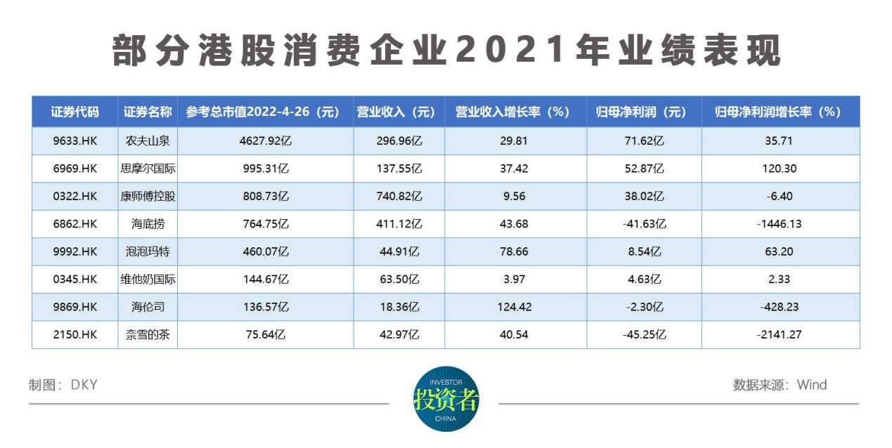 以农夫山泉、思摩尔国际、康师傅控股、海底捞、泡泡玛特、维他奶国际、海伦司、奈雪的茶8家港股消费领域上市公司为例,2021年这8家累计实现营业收入1756亿元,同比增长24%;归母净利润86.5亿元,相比2020年下降35%。