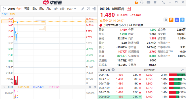 华盛资讯5月10日消息,热门小盘股$新锐医药(06108.HK)$早盘逆市活跃,短线拉升逾17%,