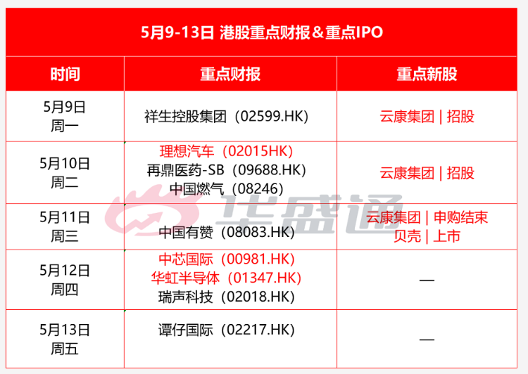 财报方面,下周港股理想汽车、中芯国际、华虹半导体等企业将发布财报,值得关注;新股方面,5月11日,贝壳在港交所挂牌上市,云康集团结束申购。