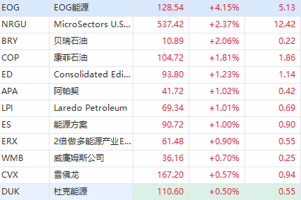 板块方面,能源股涨幅居前,其中,EOG能源涨超4%,贝瑞石油涨超2%,康菲石油、阿帕契等涨超1%。