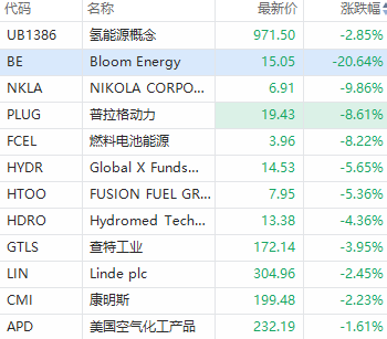 美股氢能源板块跌幅居前,Bloom Energy跌超20%,普拉格动力跌超8%,燃料电池能源跌超8%。