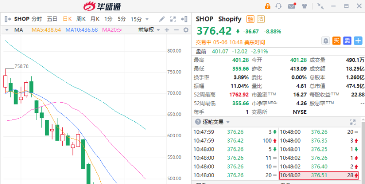 Shopify延续昨日跌势,现跌超8%,该公司昨日公布的一季度财报显示其盈利表现不佳,电子商务增长放缓。此外,方舟投资公司CEO“木头姐”旗下基金ARKK大举抄底近13万股,涉资约5286万美元。