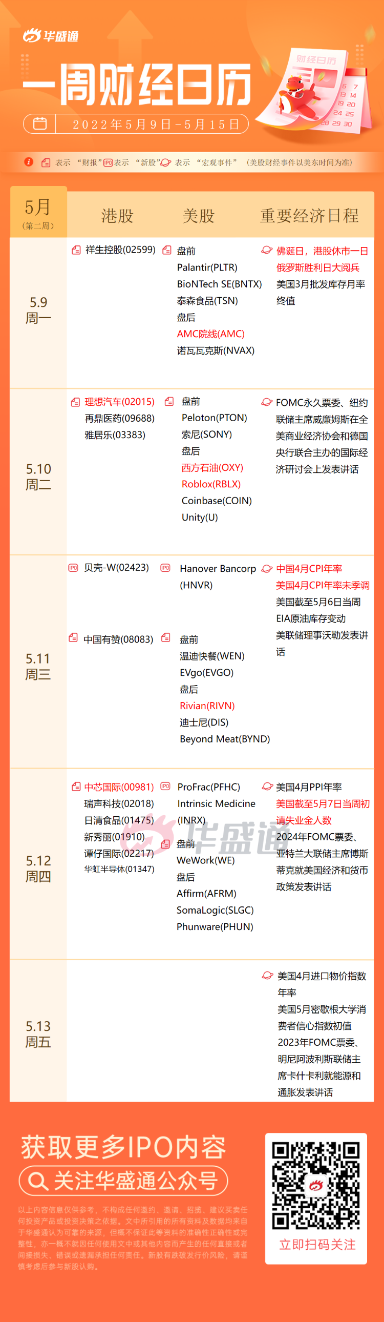 美股方面将有不少值得关注的财报:著名Meme股AMC院线、巴菲特大举加仓的西方石油、“元宇宙第一股”Roblox和“特斯拉杀手”Rivian等。此外迪士尼、索尼等老牌企业也将公布财报。