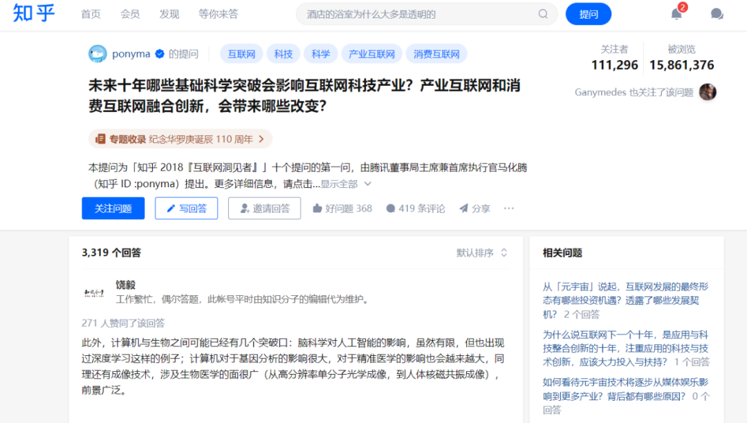 同样在2018年,马化腾在知乎的破天荒的提出天问:“未来十年哪些基础科学突破会影响互联网科技产业?产业互联网和消费互联网融合创新,会带来哪些改变?”这一提问,也引发了较大范围的波澜与热议。