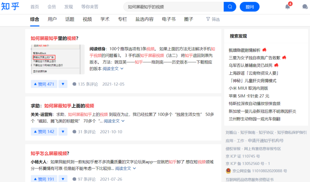 在知乎APP中,关于“如何屏蔽知乎上的视频?”的问题大量存在,排名靠前的一名叫“阅读修身”的网友详尽解释了从电脑端到手机端屏蔽的操作细节,收获了471个点赞。