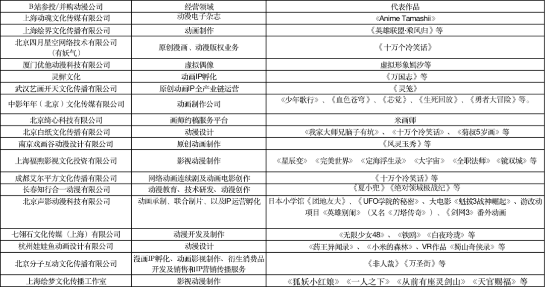 B站参投的动漫领域公司已经形成从IP孵化、动漫制作、动漫教育、动漫版权运营等全产业链协作的良性生态闭环。