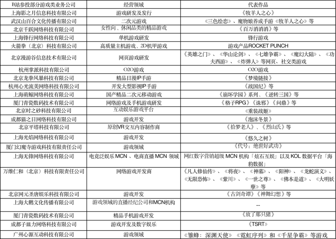 除了游戏、动漫作为B站投资的主力方向外,B站还参投了影视制作、在线阅读、有声书、娱乐营销、智能家居、电子商务等业务的公司。