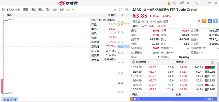 另一个市场上的明星,木头姐的ARKK今年表现也很糟糕,跌幅已超50%。值得一提的是,做空ARKK的ETF $SARK 因此取得了相当抢眼的表现,这只“伐木”ETF本周四涨近9%,今年已涨近80%。