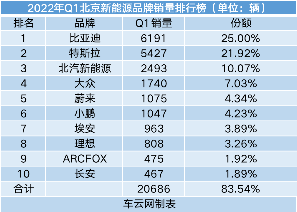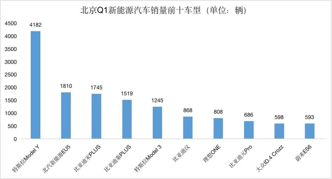 在品牌销量排行方面,比亚迪和特斯拉仍旧位居前两位,前者一季度在北京的市场份额为25%,后者则为22%。