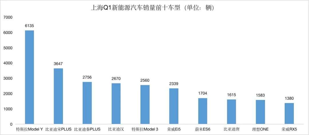 上海是目前国内新能源汽车市场最繁荣的城市,它在第一季度取得了近5.5万辆新能源车销售成绩,远高于排名第2的深圳。然而,在上海最受消费者欢迎的新能源汽车品牌却不是来自上海的特斯拉中国,而是来自深圳的比亚迪。